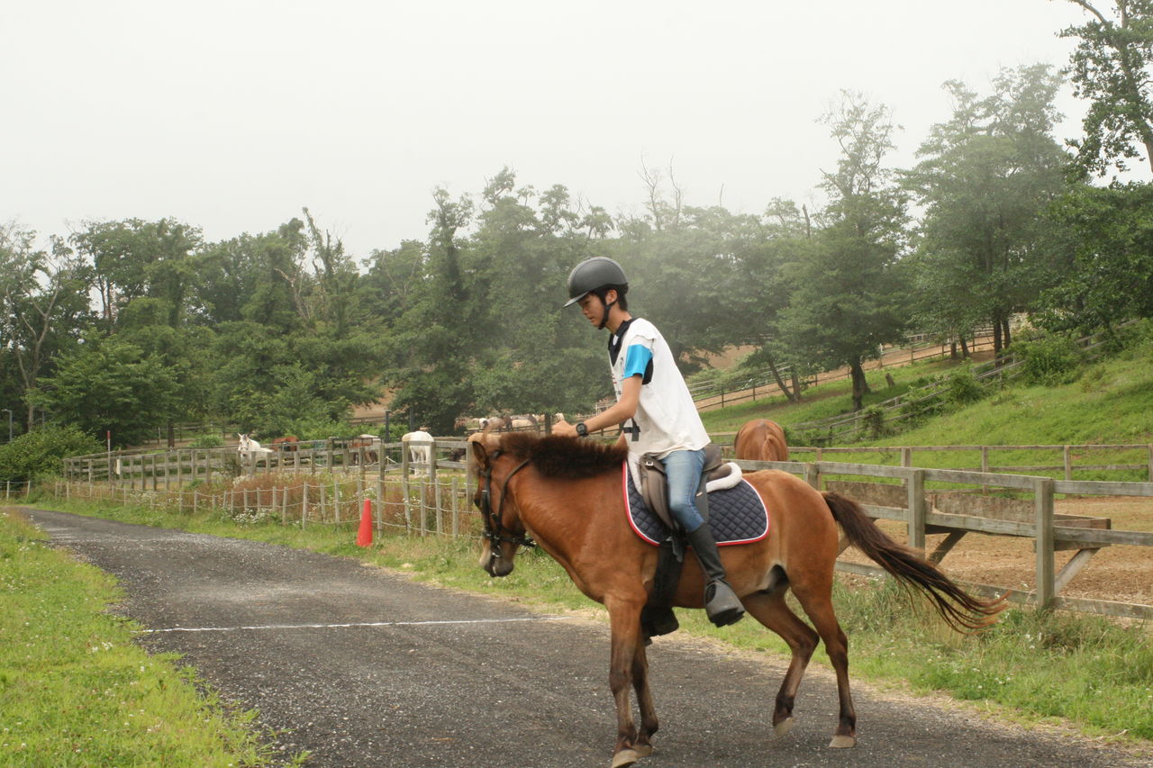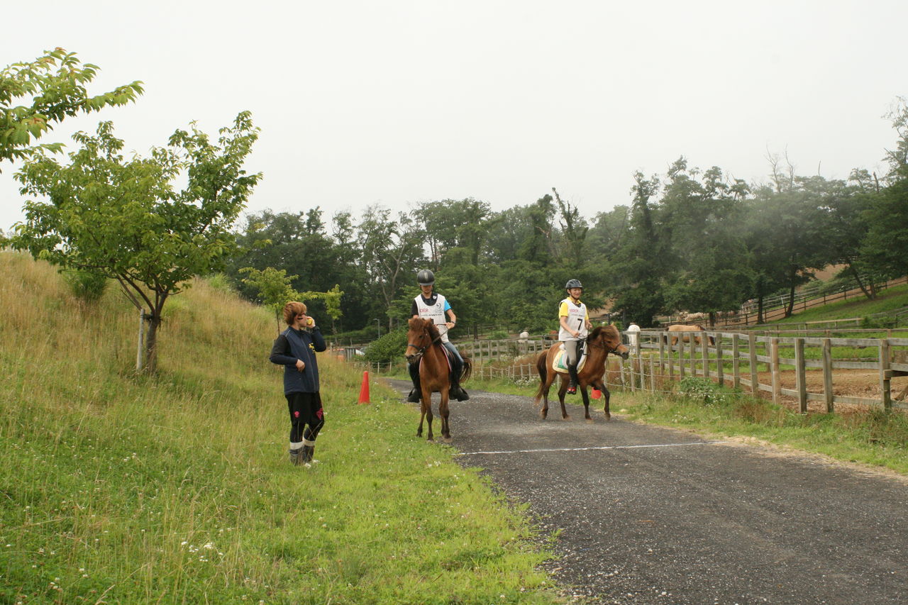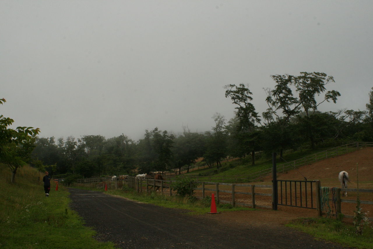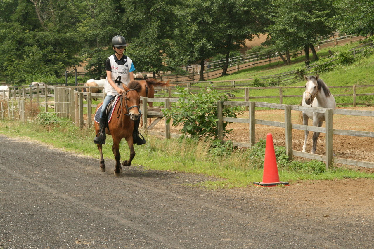 そして1頭ずつ実際のコースで練習走行。今日は暑いせいか、いつもなら一緒に暴れ回る放牧場のアラブたちは無反応でした・・・