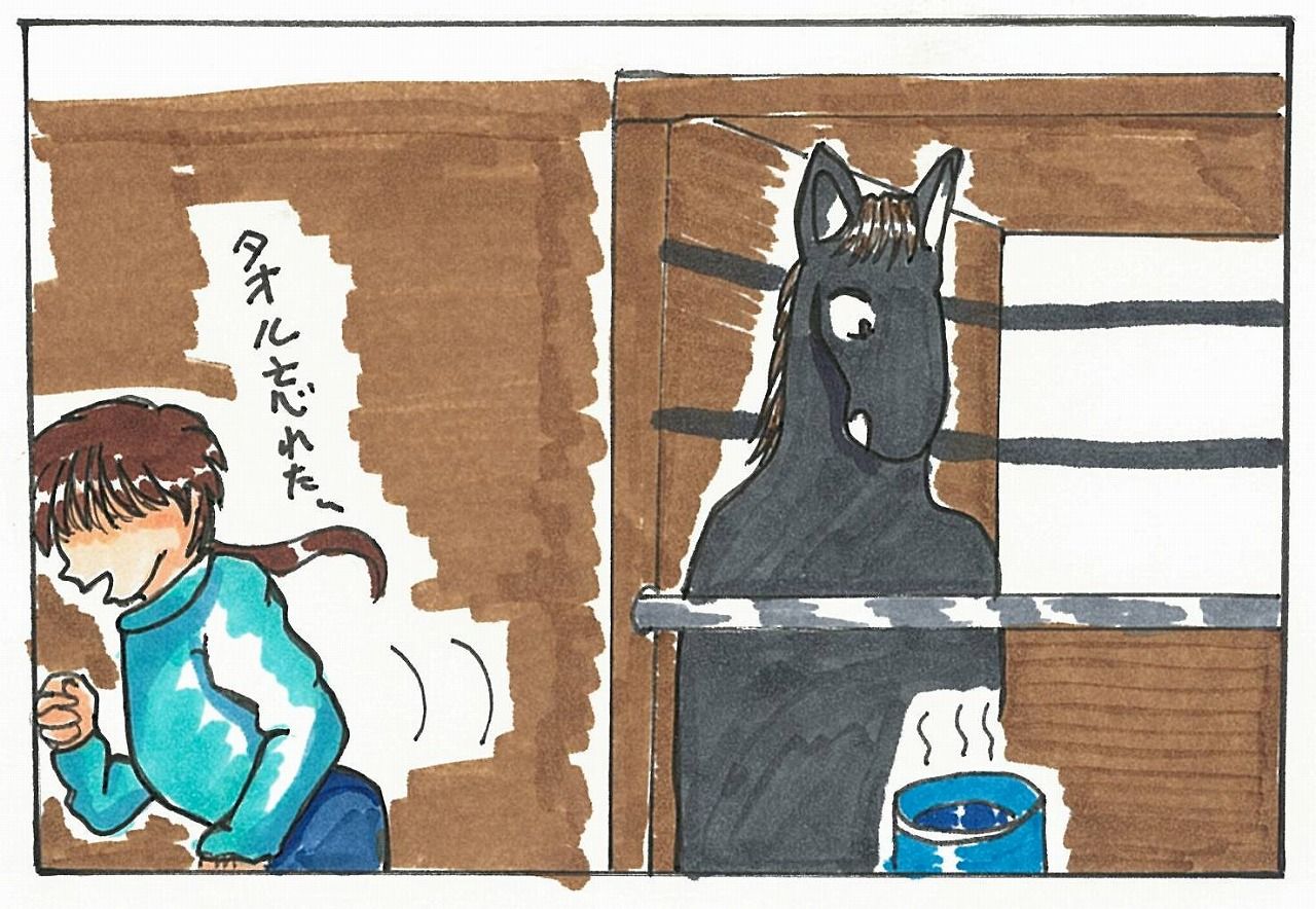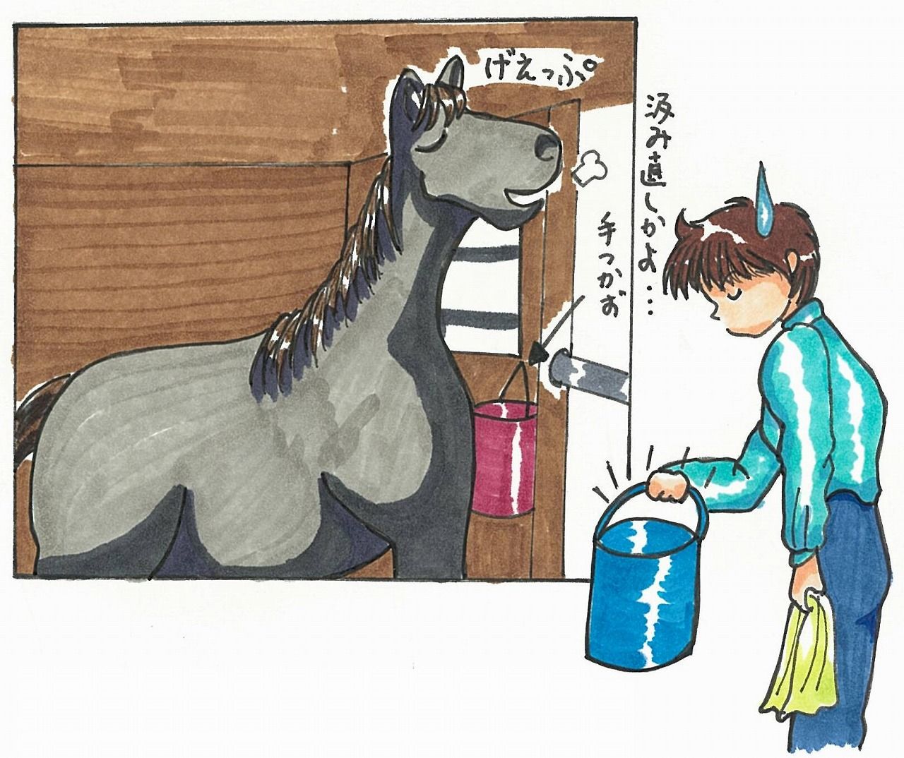 お湯の入ったバケツを馬房のすぐそばに置いたまま、少しだけその場を離れた。